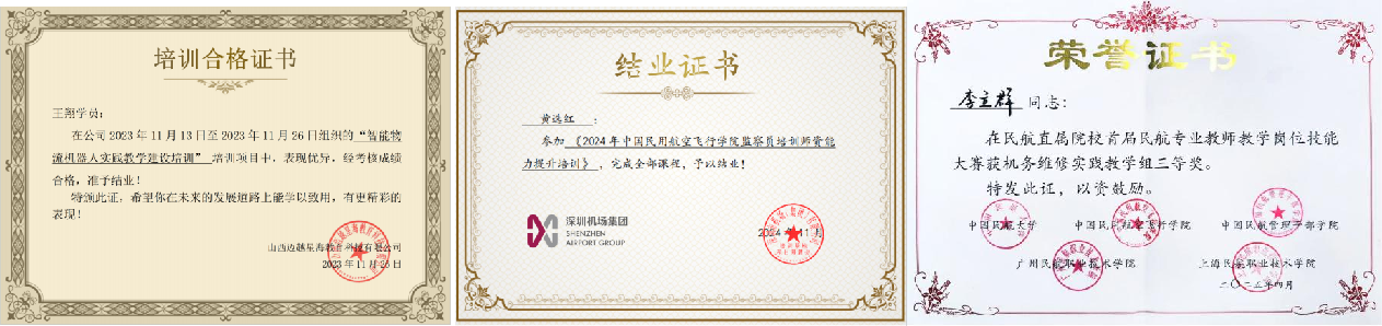 工训中心高度重视“双师双能型”师资队伍建设,通过“校企联动、双向赋能”机制,构建航空特色师资培养体系。教师基于企业实践经验,开发了20余项基于真实工作场景的实训项目,有效提升实践教学质量。通过承办、参与维修技能大赛和专项业务培训等锻炼和提升教师职业能力。教师团队在天府新校区规范高效建立起基于民航CCAR-66R3规章的147实作培训与评估体系,顺利通过民航西南管理局变更审查,有力支撑在校生高质量民航就业。