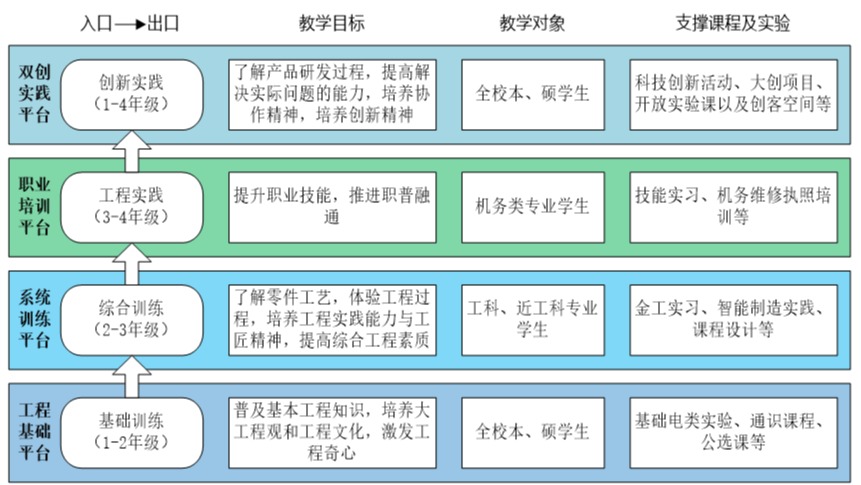 工训中心通过推进职普融通、产教融合,引入成果导向教育理念,构建了基础训练、综合训练、工程实践及创新实践四层次相互衔接的教学体系。